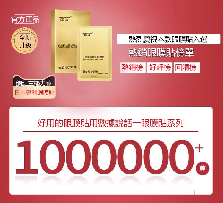 12分鐘前每晚貼一貼,輕鬆淡化眼紋、眼袋,多買多送,僅限今天!免費包郵,不滿意直接退!快下單試試吧,用了你不會後悔! - 【官網限定】1入組NT$990(8對16貼體驗裝)
