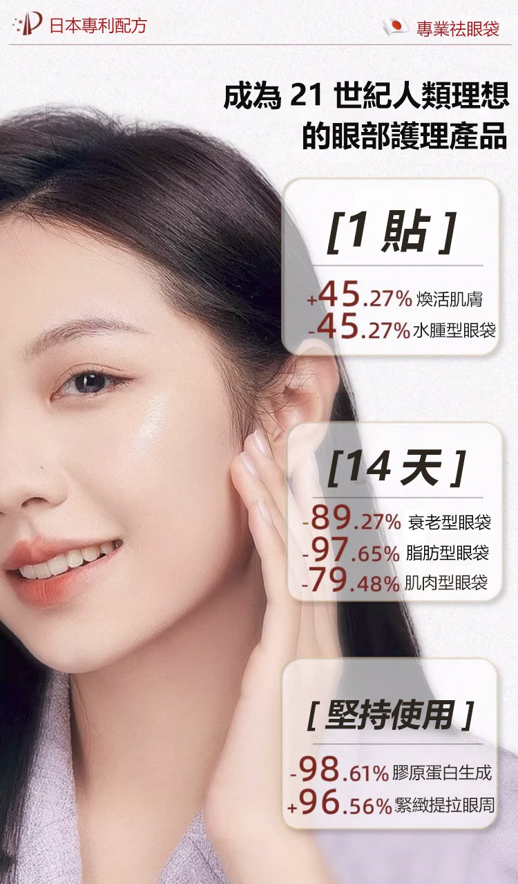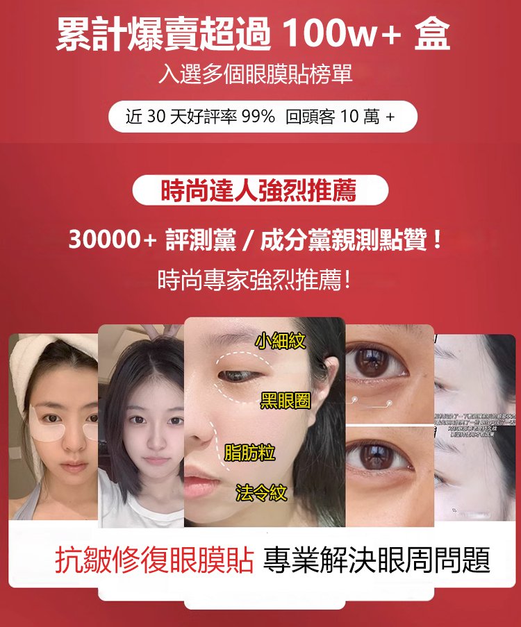 25分鐘前每晚貼一貼,輕鬆淡化眼紋、眼袋,多買多送,僅限今天!免費包郵,不滿意直接退!快下單試試吧,用了你不會後悔! - 【限時瘋搶】2入組NT$1190(16對32貼初見成效)